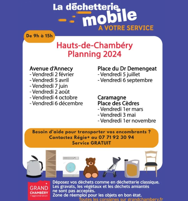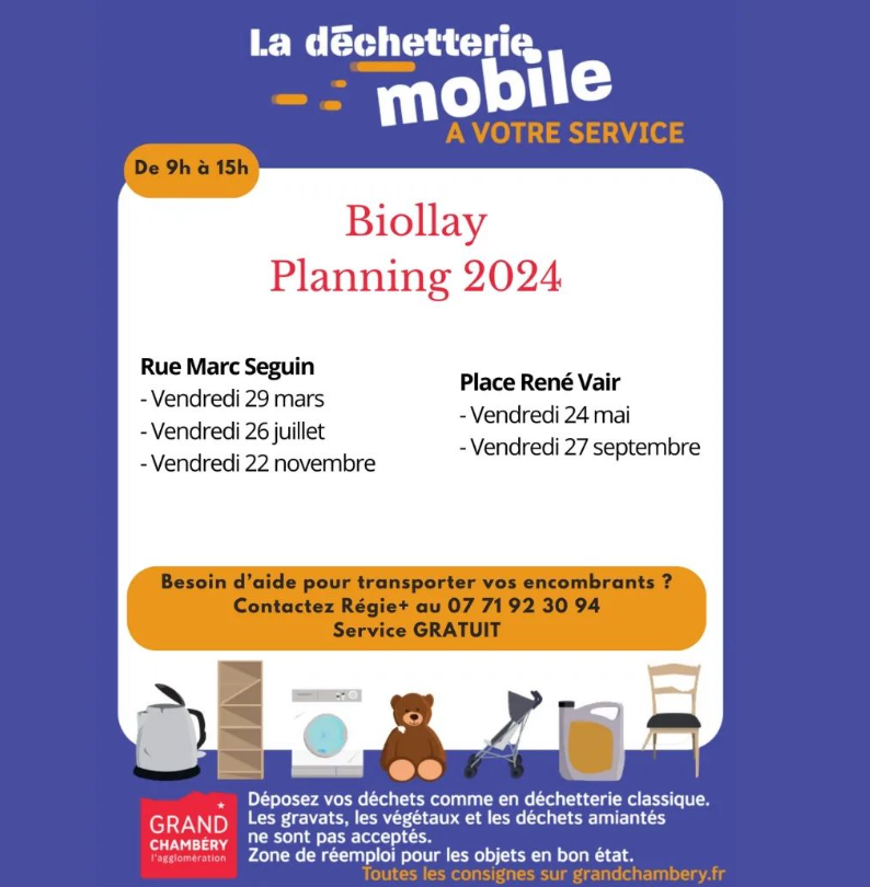 Les déchèteries mobiles ont lieu tous les mois sur les Hauts-de-Chambéry et une fois tous les deux mois au Biollay. Pour les lieux et dates exactes, consultez le calendrier sur ce lien.